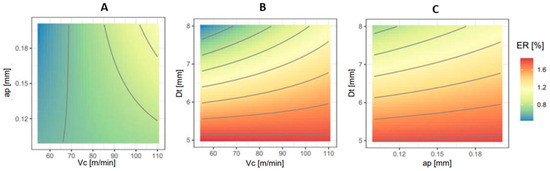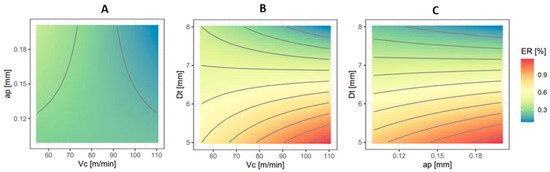 Contour plots showing the combined effects of Vc, ap, and Dt on diameter error at upper end of the hole measurements: Vc and ap interaction (A), Vc and Dt interaction (B) and ap and Dt interaction (C).