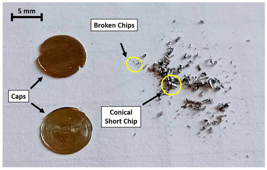 As previously stated, there are two distinct types of chips that can be produced during the HM process. In accordance with ISO 3685 [22], front cutting results in the formation of short and conical chips, whereas peripheral cutting generates broken chips (Figure 8). In addition, the lower caps, which are a consequence of deformed material with reduced thickness that was not cut, are also presented in Figure 8.