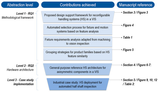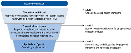 The first level (Level 1), which is theoretical and broad in scope, is addressed in Section 3 and concerns the development of a novel design framework for the systematic design of the HS in a vision-based RIM. As part of this methodology, Model-Based Definition (MBD) is explored as a data management approach that embeds semantic information, including process parameters, within the 3D geometric description of the product. This integration aims to structure information in a machine-readable format, thereby enabling potential automation in data processing. The second level (Level 2), detailed in Section 4, presents a general-purpose HS architecture for VIS inspection stations intended for axisymmetric parts, while the third level (Level 3), presented in Section 5, consists of an industrial case study conducted in collaboration with a leading automotive manufacturer, serving as a practical implementation of the proposed framework and architecture.