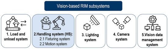 According to Lupi et al. [6], a general vision-based RIM architecture comprises five main subsystems (Figure 2): (1) a load and unload system; (2) an HS, which is further divided into (2.1) a fixturing system and (2.2) a motion system; (3) a lighting system; (4) a camera system; and (5) a vision data management system.