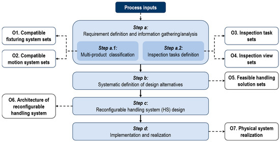 - Step c: reconfigurable HS design (Section 3.3). Using the design alternatives developed in Step b, the process converges on a unified, reconfigurable HS that strictly adheres to the RIM design principles defined in Section 2.2. The objective is to achieve rapid and cost-effective adaptability to different product variants within the same family, while ensuring consistent inspection performance and reliability.