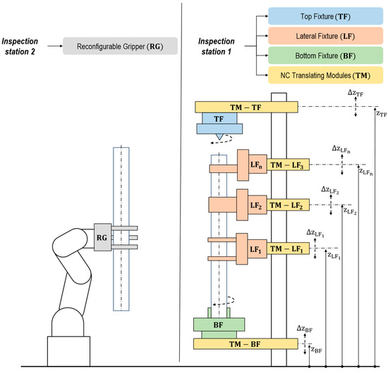 Various patented NC-based solutions have been developed to enhance inspection coverage by repositioning platforms, cameras, and lighting systems. Early configurations relied on manual setup and adjustments [11,12], while subsequent developments integrated software-driven repositionable NC modules [13,14,15]. These solutions provided rapid and precise adaptability to different product geometries without extensive reconfiguration time. However, they generally maintained a static product position during inspection, relying solely on relative movements between sensor and product. As a result, the visibility of occluded or geometrically complex features remained limited, and fully dynamic product manipulation capabilities (i.e., those provided by the handling system) were lacking.