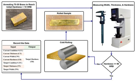 Prior to cold rolling, the samples were annealed at 600 °C to obtain an initial hardness below 10 on the Rockwell B hardness (HRB) scale, which is a dimensionless 0–100 scale, ensuring consistency in the material’s starting properties. The cold rolling process was carried out using a two-high Stanat rolling mill, which includes a pair of rollers, each with a diameter of 5 inches. The specimens underwent multiple rolling passes, with each pass achieving a random thickness reduction ranging between 1 and 2.5 mm. This process was repeated until the specimens achieved a hardness exceeding 90 HRB, indicating significant strain hardening, as shown in Figure 1. The height and width dimensions and hardness of the specimens were recorded before and after each pass to track cross sectional area changes and correlate them with hardness measurements. To enhance the model’s reliability and ensure its ability to handle variability, samples were collected from different operators, introducing natural variations in the data. A dataset of 1000 input–output pairs was generated to train and validate the ANN models. Each data point consisted of measurements from both the specimen’s current state and the target state after the rolling pass, including condition number, thickness, width, and hardness.