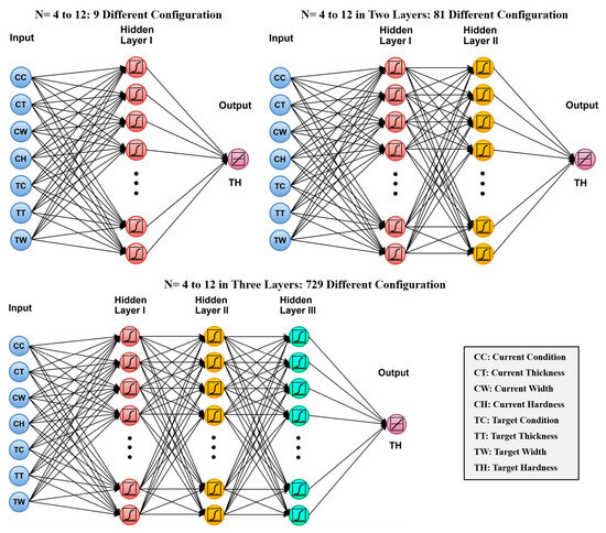 Cold rolling presents challenges due to nonlinear material deformation, fluctuating friction conditions, and strain hardening effects. Due to the complexity of predicting final material properties, ANNs are a valuable approach for capturing underlying nonlinear relationships. However, no single ANN architecture can address all requirements, as the optimal configuration depends on the type of problem being solved. This study develops multiple feedforward Rprop architectures using the logsig transfer function. Architectures with 1 to 3 hidden layers and 4 to 12 neurons in each layer were evaluated to determine the optimal configuration for predicting hardness in cold rolling, as presented in Figure 2. A total of 819 ANN architectures were evaluated, comprising 9 with one hidden layer, 81 with two hidden layers, and 729 with three hidden layers. Each architecture was trained and tested 50 times to account for the random initialization of weights and biases, ensuring comprehensive evaluation. This process resulted in a total of 40,950 simulations.