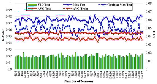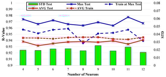 Figure 3 illustrates the performance of ANN architectures with varying numbers of neurons in networks containing one hidden layer. The horizontal axis represents the number of hidden neurons, ranging from 4 to 12, while the left vertical axis shows the R-value, and the right vertical axis indicates the STD. The figure summarizes the average test R-value (AVG Test) and standard deviation of the test R-value (STD Test), the average training R-value (AVG Train), the maximum R-value achieved in the test data across 50 runs (Max Test), and the training R-value corresponding to the maximum test R-value (Training at Max Test).