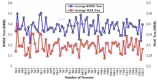 Average RMSE and MAE on test data for architectures with two hidden layers (lower values indicate better performance).