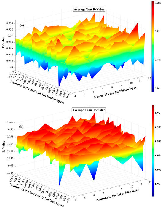 Figure 6 and Figure 7 present 3D surface plots illustrating the average performance metrics, including R-value, RMSE, and MAE, across 50 independent runs for various ANN architectures with three hidden layers. The horizontal axis on the right in the 3D plots represents the number of neurons in the first hidden layer, while the left horizontal axis represents the number of neurons in the second and third hidden layers. In Figure 6, the color scale on the right provides a visual representation of R-values, with red indicating higher values and blue representing lower ones. The dataset corresponding to this figure is included in Appendix A. Figure 6a shows that the network generally maintains average R-values between 0.940 and 0.955 on the test data, with limited fluctuation. Some variation in performance is observed across different configurations, with certain neuron structures yielding slightly higher average R-values, as shown by the red regions. This suggests that while increasing the number of neurons enhanced performance in some cases, it does not guarantee consistent improvements. Additionally, Figure 6b, which shows the average R-values for the training dataset, exhibits a narrower fluctuation range, 0.950 to 0.960, compared to that of the test data. The training average R-values were generally higher than those of the test data, indicating that the model fits the training data with higher consistency and accuracy. Moreover, higher train R-values (Figure 6b) are more uniformly distributed across architectures, while test R-values (Figure 6a) show greater variability, highlighting the sensitivity of model generalization to architectural choices.
