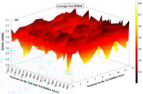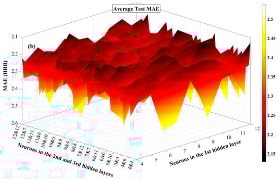Figure 7a,b present 3D surface plots illustrating the average test performance of various three-hidden-layer ANN architectures in terms of RMSE and MAE, respectively, providing a comprehensive comparison across a wide range of neuron configurations. Given that both RMSE and MAE are error metrics where lower values represent better predictive performance, the Z-axis is inverted to better demonstrate the inverse relationship between error magnitude and model performance. Across both plots, the performance surfaces exhibit noticeable local minima and gradients, indicating that network performance is sensitive to architectural configuration. Architectures with lower average RMSE and MAE correspond closely to those with higher R-values, confirming the consistency of evaluation metrics.