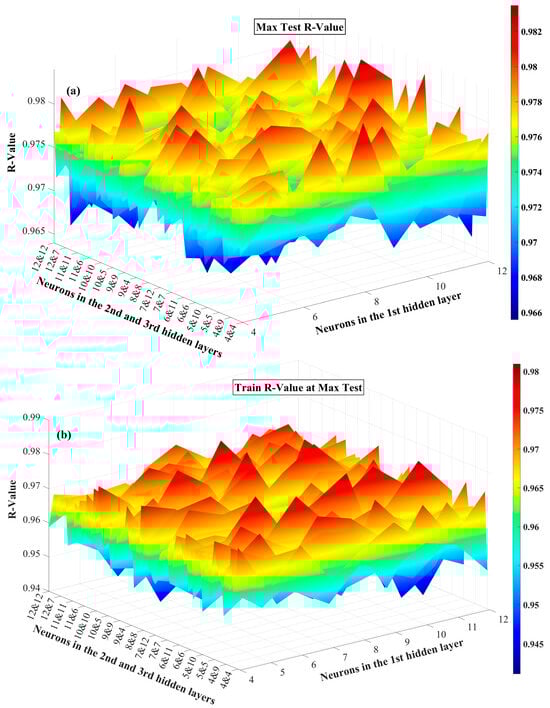 Figure 8 shows a 3D surface plot illustrating the maximum test R-values along with their corresponding training R-values for ANN architectures with three hidden layers, with the data detailed in the Appendix A. The presence of peaks in the red regions suggests that certain architectures significantly outperform others, while the blue regions indicate configurations with weaker generalization. As shown in Figure 8a, 27 architectures, approximately 3.7% of the configurations, achieved R-values above 0.98, which is lower than the proportion observed in the two-hidden-layer case (~10%). The maximum R-value in this case, 0.9835, was achieved by the 11-8-9 architecture. Figure 8b illustrates that similar to the two-hidden-layer configurations, the test R-values at peak performance exceed their corresponding training R-values. However, the overall performance of the three-hidden-layer architectures showed minimal improvement compared to the two-hidden-layer models, suggesting that increased complexity does not necessarily enhance performance. Additionally, it was revealed that some configurations with higher number of neurons such as 11 or 12 neurons in the first layer achieve slightly higher R values (e.g., 0.9835, 0.9826, 0.9825), compared to others; however, these peaks are not consistent enough to declare a clear trend favoring larger networks.
