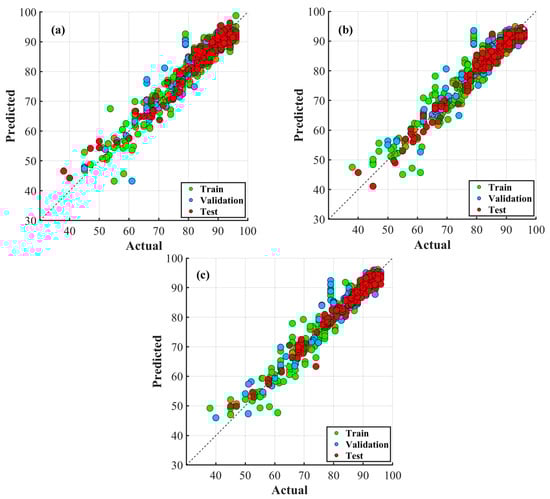 Figure 9 shows scatter plots of actual versus predicted values for ANN models with one, two, and three hidden layers, corresponding to the architectures detailed in Table 5. These plots illustrate the predictive performance of each configuration by indicating the degree of agreement between the predicted and actual values across the training, validation, and test datasets. In all three configurations, the predicted outputs closely align with the actual data points across training, validation, and test sets, demonstrating the overall effectiveness of the ANNs in capturing the underlying data relationships. The clustering of points near the diagonal indicates good prediction accuracy. The two-hidden-layer and the three-hidden-layer architectures show tighter clustering around the diagonal line relative to the one-hidden-layer architecture, implying improved model fitting and reduced prediction error. However, noticeable dispersion occurs in regions with sparse data, indicating variability and potential underfitting. This suggests that the model may not fully capture the underlying data patterns in this region.