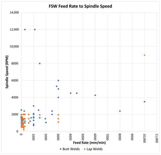 As different aluminum alloys and thicknesses require unique weld parameters to efficiently weld, one parameter set cannot be utilized for every application. However, a look into the feed rates and spindle speeds of the various applications in the literature for both the butt and lap configurations can lend insight into the general trends and further improvements to the process. Figure 2 depicts the feed rates and associated spindle speeds of parameter sets utilized across the literature for various applications and materials with the current work denoted by an orange triangle [5,6,7,8,9,10,11,12,13,14,15,16,17,18,19,20,21,22,23,24,25,26,27,28,29,30,31,32,33,34,35,36,37,38,39,40,41,42,43,44,45,46,47,48,49,50,51,52,53,54].
