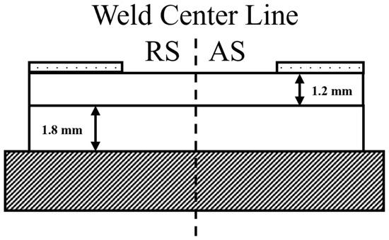 The material used for this study was AA6061-T4 sheet. Both 1.2 mm sheet (top) and 1.8 sheet (bottom), as depicted in Figure 4, were used as the baseline stack up. In all subsequent figures, the advancing side (AS) of the weld will be labeled, with the retreating side (RS) included as necessary.