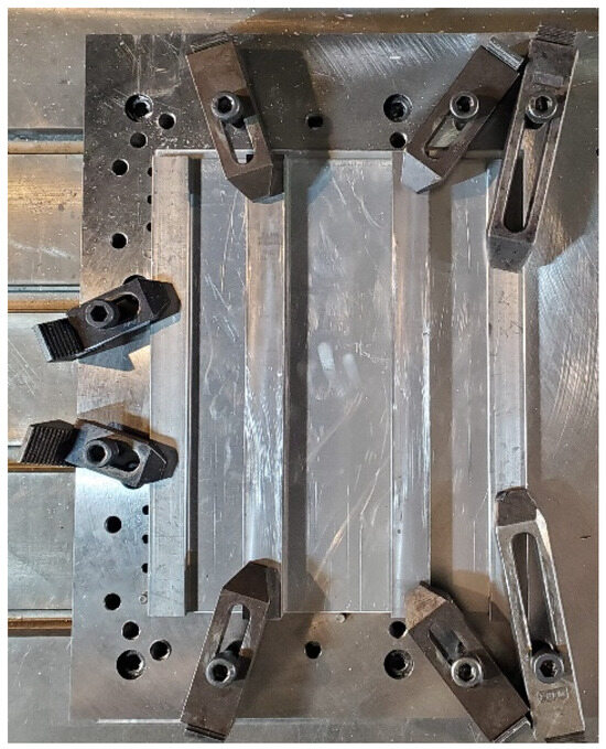 The resulting welding area available on the anvil was 500 mm × 300 mm, measuring a maximum variation in flatness of 0.09 mm across the entire surface. The clamps depicted in Figure 7, Figure 8, Figure 9 and Figure 10 and utilized in all setups were standard finger clamps, holding down varying lengths of 25 mm wide, 12.5 mm thick steel bars on the top sheet. Apart from the Tensile Sample Setup described later, all setups were similarly arranged, as depicted in Figure 4.