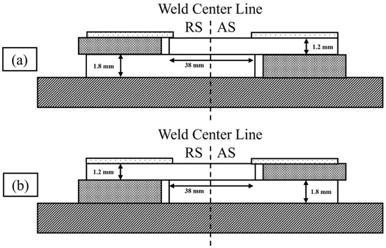 Weld setup configurations that alternated the position of the AS on the top sheet. The weld configuration in (a) contained the AS in the majority of the top sheet while (b) contained the AS in the majority of the bottom sheet.