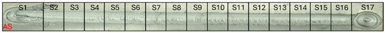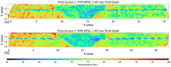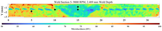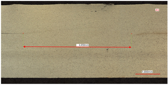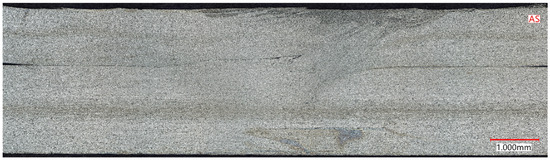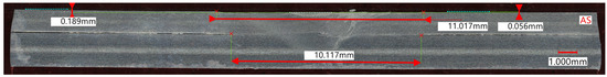 Figure 30 and Figure 31 depict the weld interfaces of the high- and low-energy welds, respectively. Notable in both interfaces is the area of consolidation, measuring about 4.5–5.5 mm in width, closely aligning with the width of the pseudo shoulder.