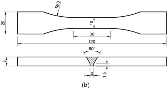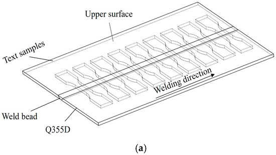This study employed an 8 mm thick high-strength low-alloy structural steel Q355D as the experimental material. Forty-two dog bone specimens were designed across three groups: base metal specimens, welded joint specimens, and laser surface-strengthened specimens (Table 1). Butt welds adopted a “V-shaped” double-bevel groove weld. Specimens were cut from welded plates using wire electrical discharge machining, then ground and polished to remove weld reinforcement awaiting post-weld LSP treatment. Specimen sampling locations and dimensions are shown in Figure 1. The welding wire grade for Q355D was ER100S-G. The chemical compositions of the base metal and welding wire are listed in Table 2. Experimental materials were welded using K-TIG welding with a welding current of 120–170 A, welding voltage of 10.5–11.9 V, and welding speed of 50–100 cm/min. The yield strengths of Q355D and ER100S-G were 730 MPa and 397 MPa, respectively. Parameters of Q355D were tested according to (GB/T 228.1—2021).