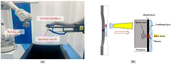 The laser shock peening equipment was the YS1505-R200EA model produced by Xi’an Tyrida Optoelectronic Technology Co., Ltd (Xi’an, China). The specimen’s upper surface was defined as the weld face reference plane, while the lower surface corresponded to the weld root backside. The laser beam was vertically irradiated onto both surfaces and full LSP treatment was applied to both the upper and lower surfaces, with treatment areas covering the weld face zone and root back zone. Current research indicates that the selection of absorption and confinement layers is crucial, as they influence shock pressure and duration. Excessively thick or thin confinement layers reduce peak pressure and affect the magnitude/distribution of residual stress [19]. Comparing existing studies [27,28], this experiment selected approximately 100 μm-thick 3M black tape as the absorption layer, and a water layer approximately 1–2 mm thick covered the target as a confinement layer. The specimen was moved along the x-y axes using a programmed robotic arm. The schematic diagram of the laser shock peening equipment and principle is shown in Figure 2.