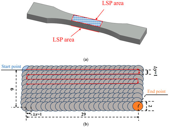 Schematic of LSP processing. (a) Treatment zone; (b) scanning path.