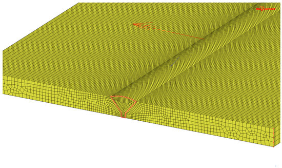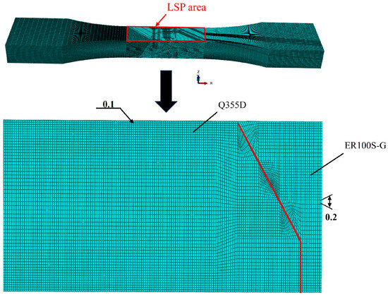 To evaluate the regulatory effect of laser shock peening (LSP) on welding residual stress, a 3D finite element model for LSP was established based on the ABAQUS/Explicit platform. The mesh configuration and treatment region are illustrated in Figure 5, meshed with 2,051,900 reduced-integration hexahedral elements (C3D8R). Local mesh refinement (minimum size 0.1 mm) was applied in the region beneath the laser shock path to accurately capture high-gradient plastic deformation. The welding residual stress field calculated by MSC.MARC was imported as a predefined field. Given the ultra-high strain rates involved in LSP, the Johnson –Cook constitutive model was adopted to characterize material dynamic plastic behavior, where its strain rate sensitivity coefficient (C) effectively quantifies shock response. The Johnson–Cook parameters for Q355D were derived from literature data fitted for Q355 steel [31]. For ER100S-G filler metal—which lacks published dynamic constitutive data—parameters were modified from aerospace high-strength steel AISI 4340 [36] (AMS 6414) by applying a yield strength reduction factor (0.91) to strain-hardening parameter A, increasing the hardening exponent n by 15% to compensate for low-carbon effects, and decreasing strain rate coefficient C by 12% to counteract strain rate sensitivity suppression in high-manganese filler metal [37,38,39]. Johnson–Cook parameters for Q355D and ER100S-G are listed in Table 4.