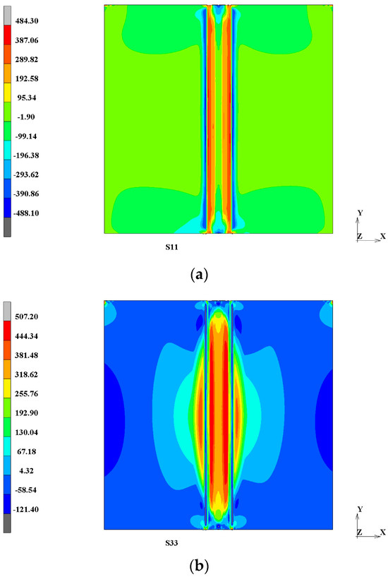 Welding residual stress distribution. (a) S11 stress distribution;(b) S22 stress distribution.