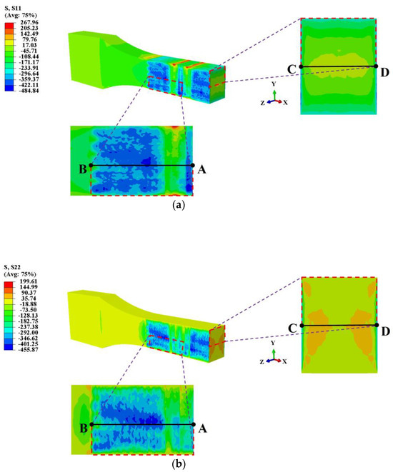 Residual stress distribution after LSP treatment. (a) S11 stress distribution; (b) S22 stress distribution.