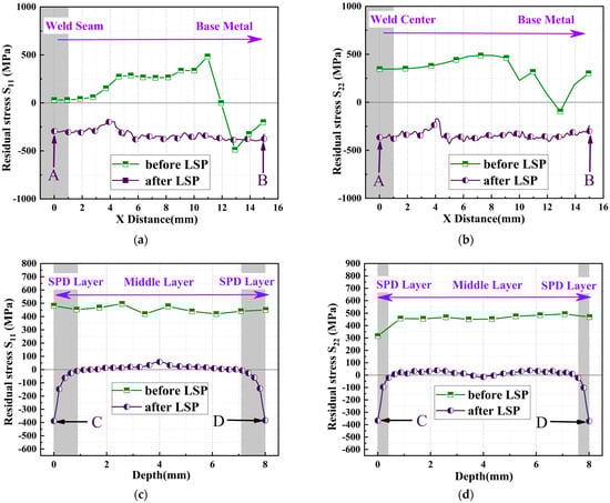 LSP-treated joint residual stress: (a) for S11 stress trends in X-direction; (b) for S22 stress trends in X-direction; (c) for S11 stress trends in depth direction (x = 11 mm); and (d) for S22 stress trends in depth direction (x = 11 mm).