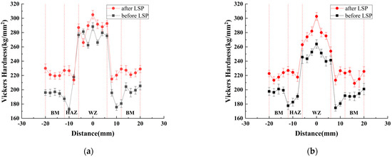In metal welding, increasing the number of weld passes leads to higher microhardness [54]. Since the upper and lower surfaces of this specimen had different numbers of weld passes, their microhardness also differed slightly. Figure 10a,b displays the microhardness distributions along the transverse direction (perpendicular to the weld) on the upper and lower surfaces, respectively. The weld zone (WZ) exhibited the highest hardness, while the heat-affected zone (HAZ) showed a distinct hardness gradient, with near-weld regions significantly harder than near-base metal regions. After LSP treatment, hardness increased in all zones. Average hardness values and strengthening amplitudes for different zones and surfaces are detailed in Table 5.