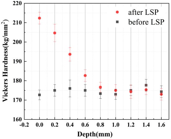 Laser-induced plasma pressure causes plastic deformation on the material surface, generating work-hardening effects in the near-surface region. The mechanical effect of shock waves diminishes with increasing distance from the surface, resulting in microhardness gradually approaching the base metal level as LSP depth increases [60]. To investigate LSP’s subsurface effects, depth-dependent microhardness distribution was tested at 10 mm from the weld center (within HAZ, Figure 11). Results reveal a continuous decreasing trend from the surface to ~700 m depth: hardness gradually declined from a peak of 215 HV at the surface to ~173 HV at ~1.6 mm depth (approaching original HAZ hardness). This clearly demonstrates that LSP-induced plastic deformation and residual compressive stress formed a typical gradient strengthening layer in the depth direction, with an effective depth of ~700 m. This strengthening layer depth is primarily controlled by parameters such as laser energy density and overlap rate [35], and is closely correlated with the material’s strain-hardening exponent, residual stress, and dislocation density [61,62]. Materials with high strain-hardening capacity can delay hardness attenuation through dislocation multiplication and grain boundary pinning effects, thereby extending the effective strengthening zone.