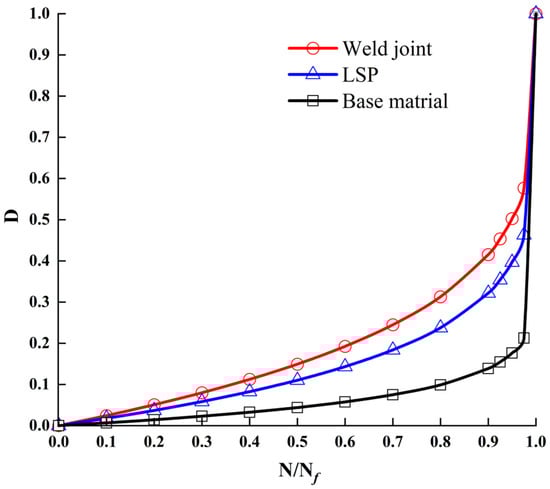 As shown in Figure 13, under fatigue loading, cumulative damage D and its corresponding curve slope increased with cycle count for all three specimen types. During the fatigue crack initiation phase (N/ < 0.5), butt-welded joints and LSP-treated specimens exhibited faster damage evolution rates than base metal. When entering the crack propagation phase (N/ > 0.5), damage behaviors diverged significantly. Butt-welded joints showed the most pronounced damage acceleration due to microstructural degradation in the heat-affected zone. In contrast, LSP-treated specimens effectively suppressed microcrack propagation rates through surface compressive stress and grain refinement. At the failure critical interval (N/ = 0.9−1), damage accumulation rates surged to maximum values in all specimens. Comparative analysis demonstrated that although damage accumulation in LSP-treated specimens exceeded base metal, their damage rate was significantly lower than untreated butt welds, demonstrating LSP’s effectiveness in delaying damage accumulation.
