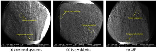 As shown in Figure 15a, Figure 16a and Figure 17a, crack initiation universally originated at surface stress concentration points. In welded joint specimens, grain coarsening in the heat-affected zone (HAZ) and fusion line weakening led to multiple secondary crack sources initiating from microstructural heterogeneous regions along propagation paths. Notably, initiation zones in welded specimens were frequently located in the previously identified high-residual-tensile-stress region (18 mm from weld), exhibiting high microcrack density—closely related to microstructural weakening and residual tensile stress concentration. After LSP treatment, microcrack density in the initiation zone significantly decreased. Residual stress analysis (Figure 8) and cyclic strain distribution (Figure 9d) confirm that the surface compressive stress introduced by LSP effectively suppressed crack initiation propensity in the original high-tensile-stress zone.