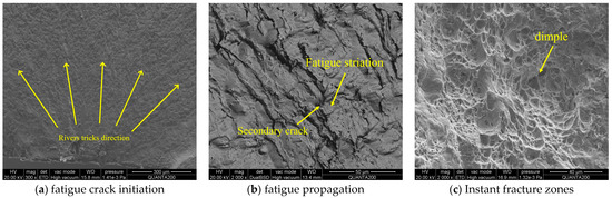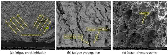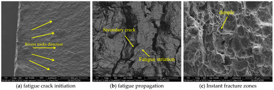 Fatigue fracture zones of specimens were observed using a scanning electron microscope. The fracture morphology is shown in Figure 14. Based on fracture mechanisms, the fracture morphology was categorized into the fatigue crack initiation zone, fatigue crack propagation zone, and final fracture zone. The overall morphology exhibited a progressive transition from initial smooth features to final rough characteristics, with significant differences in zonal features among specimens.