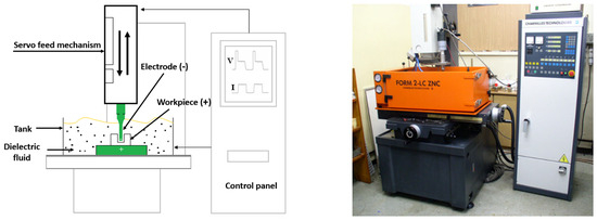 The experimental studies were conducted using the EDM machine Charmilles Form 2LC ZNC manufactured by AGIE CHARMILLES, which is located in Geneva, Switzerland. The EDM machine and the schematic of the process are shown in Figure 1. Electrolytic copper with a cross section of 8 × 5 mm and a length of 70 mm was used for this study, and kerosene Fluxelf2 was allowed to flow as the working fluid with a resistivity of 7.4 × 1010 Ω cm.