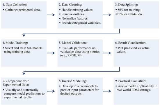 The experimental results from the experimental layout were utilized as a dataset in machine learning to predict the material removal rate and surface parameter (Sa). The work began by conducting extensive experimental work to collect the data from the experiments, which was then split into training (80% of the collected data) and validation (20% of the collected data) data.