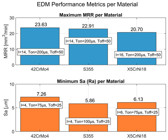 In this study, we considered three factors: the EDM peak current, pulse-on time, and pulse-off time for three different materials. Two responses, the MRR and Sa, were measured across all the materials. In general, materials A (42CrMo4) and B (S355) had the highest MRRs, while material C (X5CrNi18-10) exhibited a minimal MRR under various combinations of factors, as depicted in Figure 4, which can be attributed to the nature of the material.