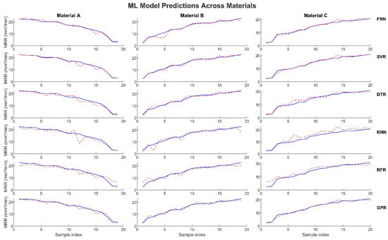 Figure 5 shows the MRR training results. The experimental data is shown as continuous blue lines, and the predicted data is represented by dashed red lines. As discussed earlier, 80% of the data (76 samples) were employed to train the developed ML models. In general, all the models showed similar trends to the experimental data. The GPR model demonstrated an excellent correlation with the experimental data across all the materials, while the KNN model exhibited some deviation at a high sample index, which could be because of its sensitivity to local noise, such that the presence of noisy data in the local neighborhood may lead to deviations in the predictions.