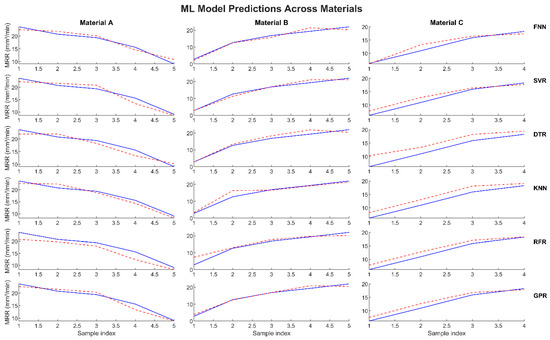 Actual vs. predicted MRR values for the trained data (seen data). All the models showed similar trends to the experimental data across all the materials. The GPR demonstrated an excellent correlation with the experimental data. Note: The experimental data is shown as continuous blue lines, and the predicted data is shown as dashed red lines.