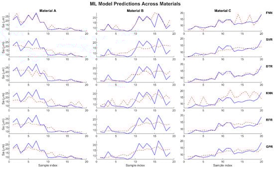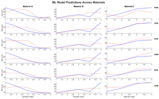 Similarly, the proposed models were tested for Sa in unseen data. Figure 8 shows the model predictions for the unseen experimental data. For all three materials, the GPR model was superior to the other models, and the SVR and DTR models were the second and third best models, respectively. The KNN model, however, showed a significant deviation across all the materials, while the RFR model only showed deviation for materials A and B. The FNN model showed a favorable prediction for material C and some deviation for materials A and B.