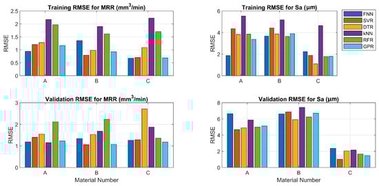 The RMSE is essential in hyperparameter tuning and model selection and, at the same time, provides a quantitative measure to compare different models or configurations, confirming that the selected model generalizes well to unseen data [28,29,30]. Figure 9 shows the RMSEs for the training and validation data for both the MRR and Sa; similar results are listed in Table 4 and Table 5 for the MRR and Sa, respectively.