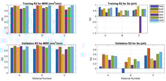 Figure 10 shows a bar chart of the R2 values across the proposed materials and models, and the same results are listed in Table 6. The achieved R2 values (i.e., the MRR training dataset) for both the GPR and SVR models are more than 0.97, indicating that the model discovered around 97% of the total variation in the observed Sa values for materials A, B, and C.