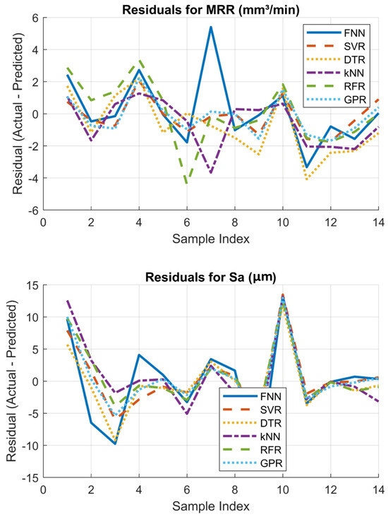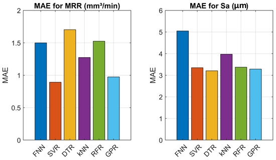 Figure 11 shows the residual plots for the predicted outputs (MRR and Sa) across all the materials using the validation dataset, revealing the validity of the GPR and SVR models with low residuals across the three materials considered, which can also be seen in Figure 12, where the MAEs are shown for all the ML models.