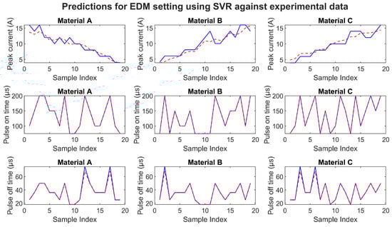 The results of the EDM setting prediction utilizing unseen data are summarized in Figure 13. Valuable predictions were demonstrated for the three materials, with better predictions for the pulse-on time, and moderate predictions for both the pulse-off time and peak current. In general, these results can be integrated with the EDM controller for real-time decision making to determine the MRR and Sa.