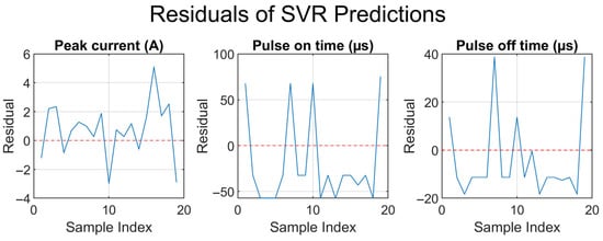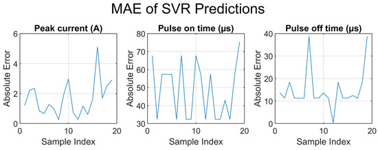 Figure 14 and Figure 15 show the MAE and residual plots of the unseen dataset of the proposed inverse model. Figure 14 shows the MAEs of the peak current, pulse-on time, and pulse-off time of the inverse model in detail. Clearly, the prediction was more accurate for the pulse-on time, followed by those for the pulse-off time and peak current. A similar trend is shown in Figure 15, where the residuals are plotted for the aforementioned outputs. These results highlight the validity of the future implementation of the proposed inverse model in EDM processes in scenarios where the target MRR and Sa values are specified, allowing the EDM system to automatically select and implement the optimal process parameters.