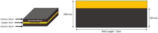 Lithium-ion batteries (LIBs) have transformed modern technology, powering a wide range of applications from renewable energy storage systems to electric vehicles. Electric vehicles (EVs) have tremendous potential for a sustainable future with carbon-free and energy-efficient transportation []. The current state-of-the-art LIBs (based on graphite anodes) are nearing their theoretical capacity limits (372 mAh/g) []. This limitation prevents them from fully addressing consumer concerns about range anxiety and cost. Consequently, there has been a sharp increase in the demand for high-capacity batteries that can power vehicles for long ranges on a single charge. Secondary lithium metal batteries (LMBs) have gained significant attention for their substantially higher energy density, positioning them as a promising solution for high-energy battery packs in EV applications [,]. The key differentiating component of LMBs compared to LIBs is the lithium metal (LiM) anode. LiM is considered an ideal anode material due to its inherent advantages, including high specific capacity (3860 mAh/g), low density (0.534 g/cm3), and the lowest electrode potential (−3.04 V) []. LMBs do not require any lithium ‘host’ and charge by plating pure Li on the negative electrode (LiM) instead of intercalating it into graphite. Despite the high energy density of LMBs, their implementation is hindered by electrochemical instabilities [,]. Researchers have been developing various strategies to mitigate these issues [,,]. Even if the electrochemical performance issues are mitigated, additional challenges persist with the high-volume cell manufacturing of LMBs. These include handling thin lithium metal foils due to lithium’s highly reactive nature as an alkali metal and specific physical and chemical properties of LMBs.