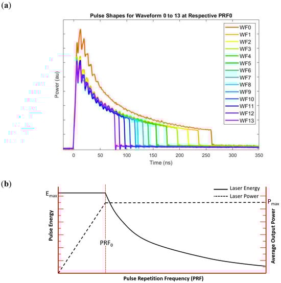 (a) Representative pulse shapes at base frequency (PRF0) for waveforms WF0 to WF13, showing variations in peak power and pulse duration. (b) Effect of increasing pulse repetition frequency (PRF) on pulse energy and average output power.