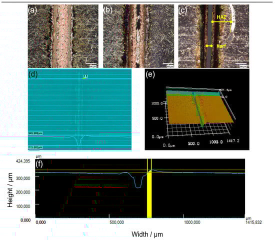The interaction between the laser and the lithium material results in distinct characteristics at the cut edge, including the HAZ, bulge, and spatter. These thermal effects can significantly influence the electrochemical behavior of the lithium anode by altering its microstructure, leading to localized recrystallization or phase changes that increase resistance and negatively impact battery performance []. Additionally, uneven surfaces can cause inhomogeneous current density distribution, increasing the risk of dendrite formation and internal short circuits []. Particles ejected during laser cutting can redeposit on the lithium surface, creating hotspots of increased reactivity and enhancing side reactions with the electrolyte, leading to gas formation and battery swelling []. Therefore, an optimal set of cutting process parameters should address these challenges by achieving the best possible cutting characteristics. To evaluate cut quality and process performance, optical microscopy (Model VHX-2000 Keyence, Osaka, Japan) and laser scanning microscopy (Model VK-9710, Keyence, Osaka, Japan) were utilized. Image analysis and quantification were performed using the VK Analyzer software provided by Keyence. The cutting results were categorized into three groups: “Cut”, “Partial Cut”, and “No Cut.” A sample was classified as “Cut” if it exhibited a complete and continuous kerf along the laser path. “Partial Cut” referred to samples with incomplete cuts or irregularities along the cut edge. Samples that showed only the ablation of the LiM coating at the laser entry side, without penetrating the copper foils, were categorized as “No Cut.” Only samples meeting the “Cut” criteria were selected for further quantitative analysis. To evaluate the cut quality, kerf width, heat-affected zone (HAZ) width, and bulge height values were measured for selected samples. Representative results from the three different cutting conditions are presented in Figure 5a–c, with Figure 5c highlighting the characteristic kerf and HAZ features observed in “Cut” samples. The bulge height, defined as the elevation of lithium above the initial thickness of the coated layer, is illustrated in Figure 5d. For each selected sample, five to six measurement points were obtained along the 30 mm laser cutting path. To minimize the influence of effects associated with the start and end of the cut process, measurements were taken at positions corresponding to approximately 30%, 50%, and 70% of the path length.