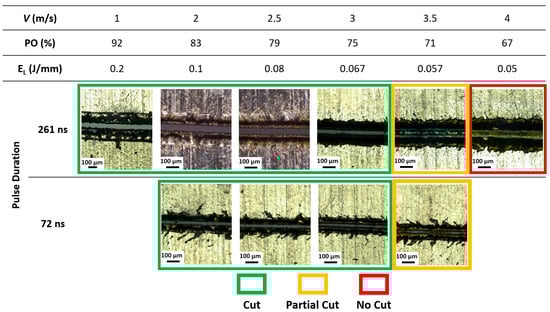 As the objective of the study was to achieve high cutting speeds with reliable quality, an initial round of testing was carried out to determine the maximum achievable cutting speed (Vmax) in a single-pass laser cutting process. Vmax is defined as the highest scanning speed at which a stable and continuous cutting kerf can be produced, without the presence of incomplete material separation. To investigate this, experiments were conducted using two different pulse durations: 72 nanoseconds (ns) and 261 ns. These durations represent short and long pulse regimes, respectively, which are known to have distinct pulse profiles and energy delivery characteristics with the material. The laser power was fixed at 200 W (the maximum output power of the laser system) to ensure that the full capacity of the system was utilized during these trials. The scanning speed was increased in increments of 500 mm/s until a threshold was reached, beyond which full material penetration and clean kerf formation could no longer be maintained. This stepwise approach enabled the precise identification of the Vmax for each pulse duration. It is important to note that pulse energy is a function of both laser power and pulse repetition frequency (PRF), as outlined in Equation (1). Therefore, to isolate the effect of scanning speed and avoid fluctuations in pulse energy, the PRF was kept constant at the base repetition rate (PRF0) for each respective pulse duration, 510 kHz for 72 ns and 200 kHz for 261 ns. This approach resulted in fixed pulse energies during the tests: 1.03 mJ for the 261 ns pulses and 0.41 mJ for the 72 ns pulses. Maintaining a constant pulse energy ensured that the observed changes in cutting performance could be attributed primarily to the variation in scanning speed, rather than confounding effects of varying energy per pulse. As shown in Figure 6, cut quality progressively deteriorates with increasing scanning speed in both cases. Continuous cuts with the absence of uncut bridges were achieved up to a maximum scanning speed of 3 m/s, beyond which the kerf quality transitioned into partial cuts (yellow borders) or no cuts (red borders). This establishes 3 m/s as the maximum achievable single-pass cutting speed for full cuts under these specific energy and pulse duration conditions.