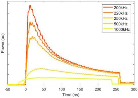 At a fixed pulse duration of 261 ns, varying the pulse repetition rate from 200 kHz (PRF0) to 510 kHz while maintaining a constant scanning speed (3 m/s) and line energy (0.06667 J/mm) reveals a critical interplay between pulse overlap, energy delivery, and cutting performance. As the PRF increases, pulse overlap improves from 75% to 90%, enhancing the spatial uniformity of energy distribution along the cut path. However, this improvement in overlap comes at the cost of reduced pulse energy (from 1.03 mJ to 0.41 mJ) and peak power (from 3.96 kW to 1.55 kW). As shown in Figure 7, the decrease in peak power—confirmed by pulse shape profiles—results in a pronounced flattening of the temporal power envelope at higher PRFs, thereby limiting the generation of recoil pressure and localized vaporization necessary for efficient ablation [].