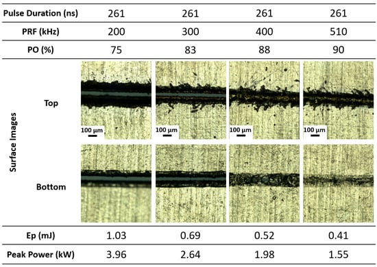 The analysis of laser cut images on both sides of laser entrance and exit reveals a clear deterioration in cut quality with increasing pulse repetition frequency (PRF), characterized by reduced penetration depth, increased dross accumulation, and irregular kerf morphology. This decline is attributed to the reduction in per-pulse energy and peak power at higher PRFs. Experimental evidence indicates that meeting the pulse energy threshold alone is insufficient to ensure successful cutting. For instance, at higher PRFs corresponding to pulse durations of 400 and 510 ns, cuts were unsuccessful despite pulse energies exceeding 0.4 mJ. This highlights the presence of a dual-threshold condition, where both pulse energy (>~0.4 mJ) and peak power (>~2.4 kW) must be met to maintain effective melt ejection and continuous cutting. These findings, supported by the observations in Figure 8, underscore the importance of balancing pulse overlap with sufficient instantaneous power when optimizing PRF for high-speed laser processing. Failure to maintain this balance compromises ablation efficiency, even when line energy remains constant, emphasizing the critical role of temporal energy delivery in laser–material interaction.