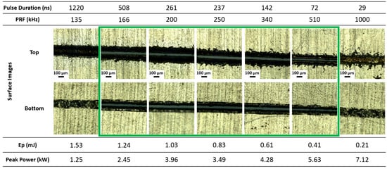 In this section, the influence of laser pulse duration and pulse repetition frequency (PRF) on the cut quality and thermal response of the material is systematically investigated within a defined parameter space as highlighted in Figure 9. The experiments were conducted at a constant feed rate of 3 m/s. The primary focus of this section is the characterization of the heat-affected zone (HAZ), the kerf width, and the extent of bulge height as a function of the applied laser parameters. The quantitative data and corresponding graphs are shown Figure 10.