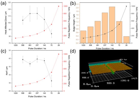 (a) HAZ width, (b) bulge height, and (c) kerf width as functions of pulse duration. Note: x-axes in (a–c) are reversed, decreasing left to right. (d) Representative LSM image of cut edge.